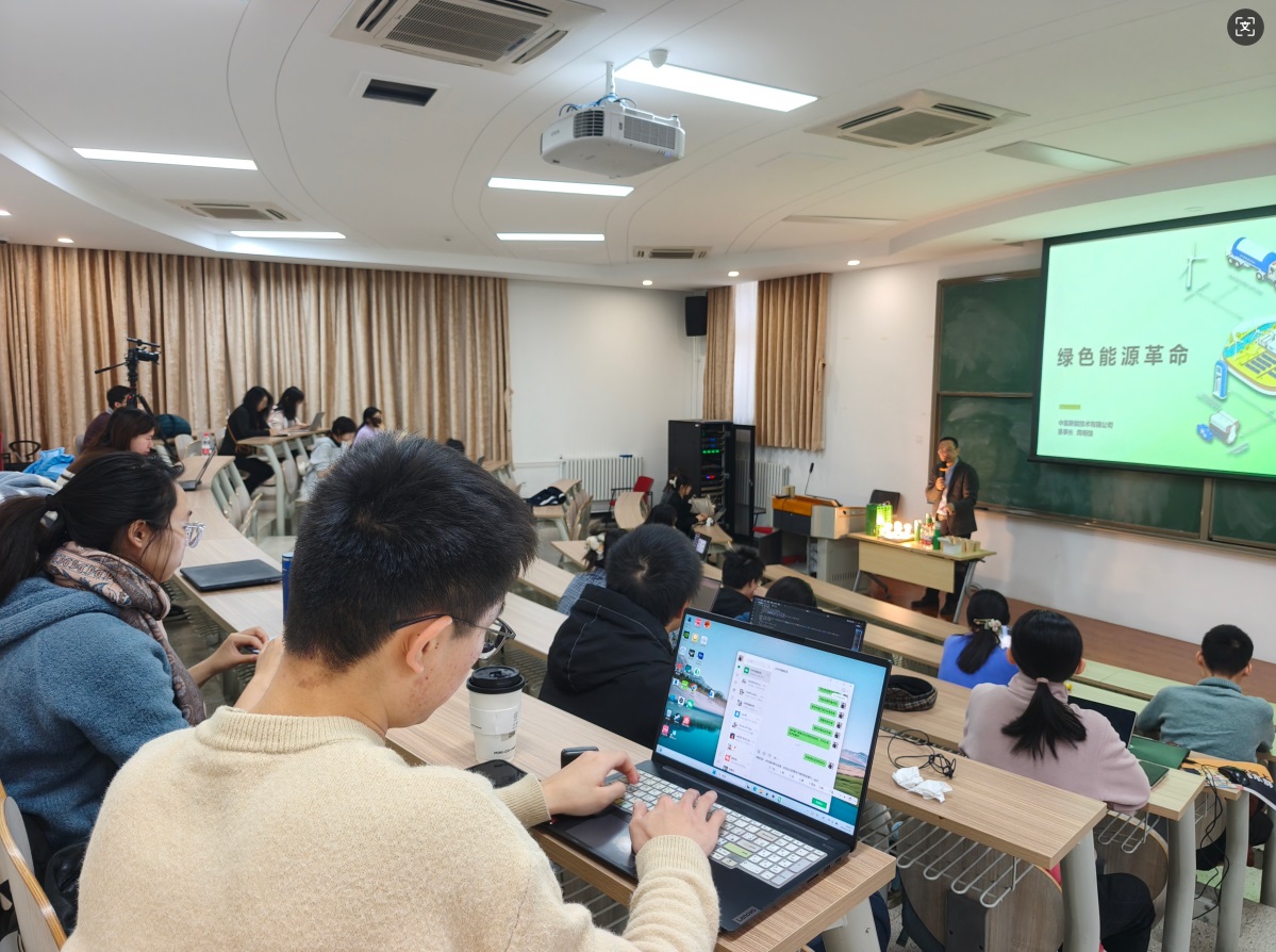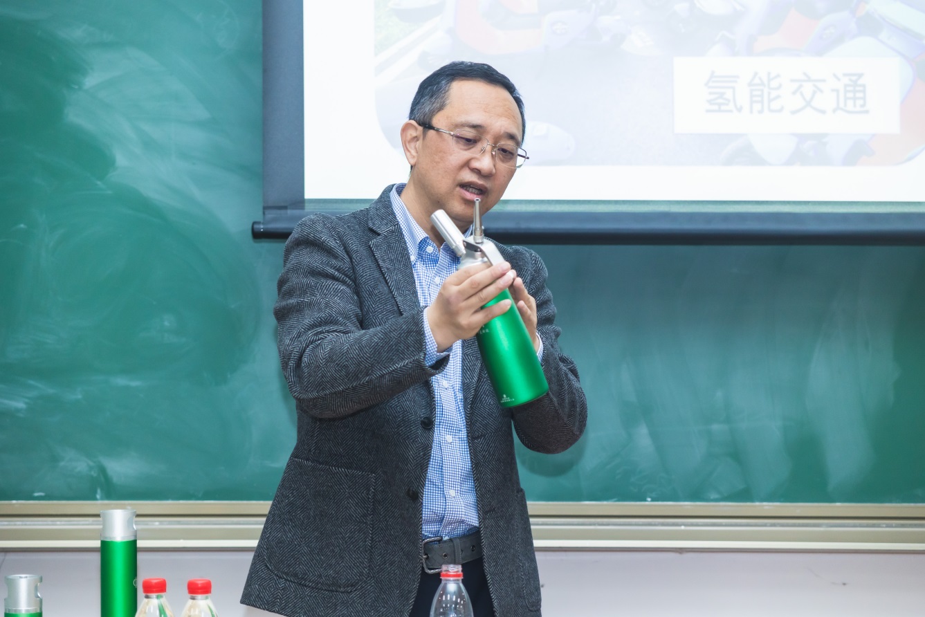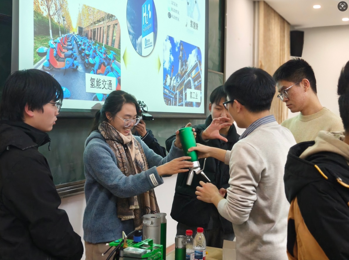 “能源强国的蓝图,正需青年一代的敢闯与坚守,而全球能源转型的浪潮,更呼唤跨越国界的协作与担当。这能源的火种,自先辈擘画能源发展之路时便已点燃,如今更需我辈青年接续传递,让它在时代浪潮中愈燃愈旺。”讲座现场,周明强董事长结合自身创业历程,立足全球能源发展趋势,将氢能产业的发展脉络与国家“十五五”能源战略、全球脱碳进程紧密相连。他讲到,当前全球能源转型虽坚定前行,但仍面临投资不均、地缘政治干扰、技术壁垒等多重挑战,70%的新能源研发投入集中在美欧发达经济体,发展中经济体获取清洁能源技术的成本平均高出40%以上。从欧盟240亿欧元打造的氢能主干管网,到中国京津冀、长三角的氢走廊布局;从美国《通胀削减法案》的绿氢补贴政策,到中国绿氢产能突破22万吨/年的产业跃迁,全球氢能发展已形成“五极竞合”的战略格局,而打破技术封锁、构建公平公正的国际能源秩序,正是青年一代的时代命题。周明强董事长以氢燃料电池发电系统技术的突破、固态储氢的安全革新为例,讲述中国企业如何在氢能技术研发领域实现专利领跑,更通过中氢新能产业布局东南亚、中东等国家的生动实践,展现中国氢能技术“走出去”助力全球碳减排的责任担当。从冬奥除雪车的零碳实践到氢能走入日常生活的探索,他用一个个脚踏实地的创业故事,解读着“21世纪终极清洁能源”的破局之路,更传递着“建立自我、追求忘我”的企业家情怀。前沿的行业洞见、宏大的全球视野与滚烫的励志初心交织,为在场学子点亮了绿色能源领域的探索灯塔,也让这份能源传承的火种,在青年心中深深扎根、蓄势燎原。